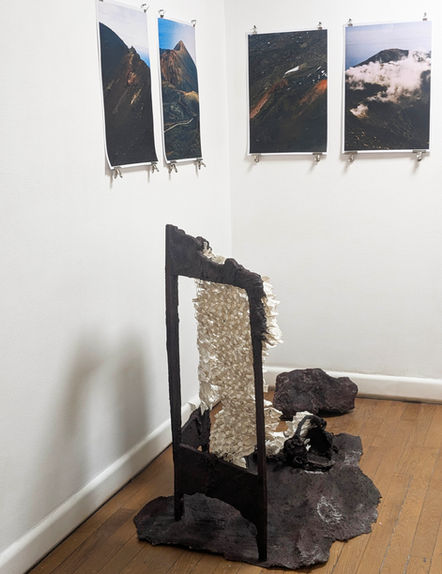 Dans cette pièce, une éruption a laissé place à un tapis de basalte. Les objets qui se trouvaient sur son passage ont été soudés à la matière, devenus tuteurs de pierres insolites.
